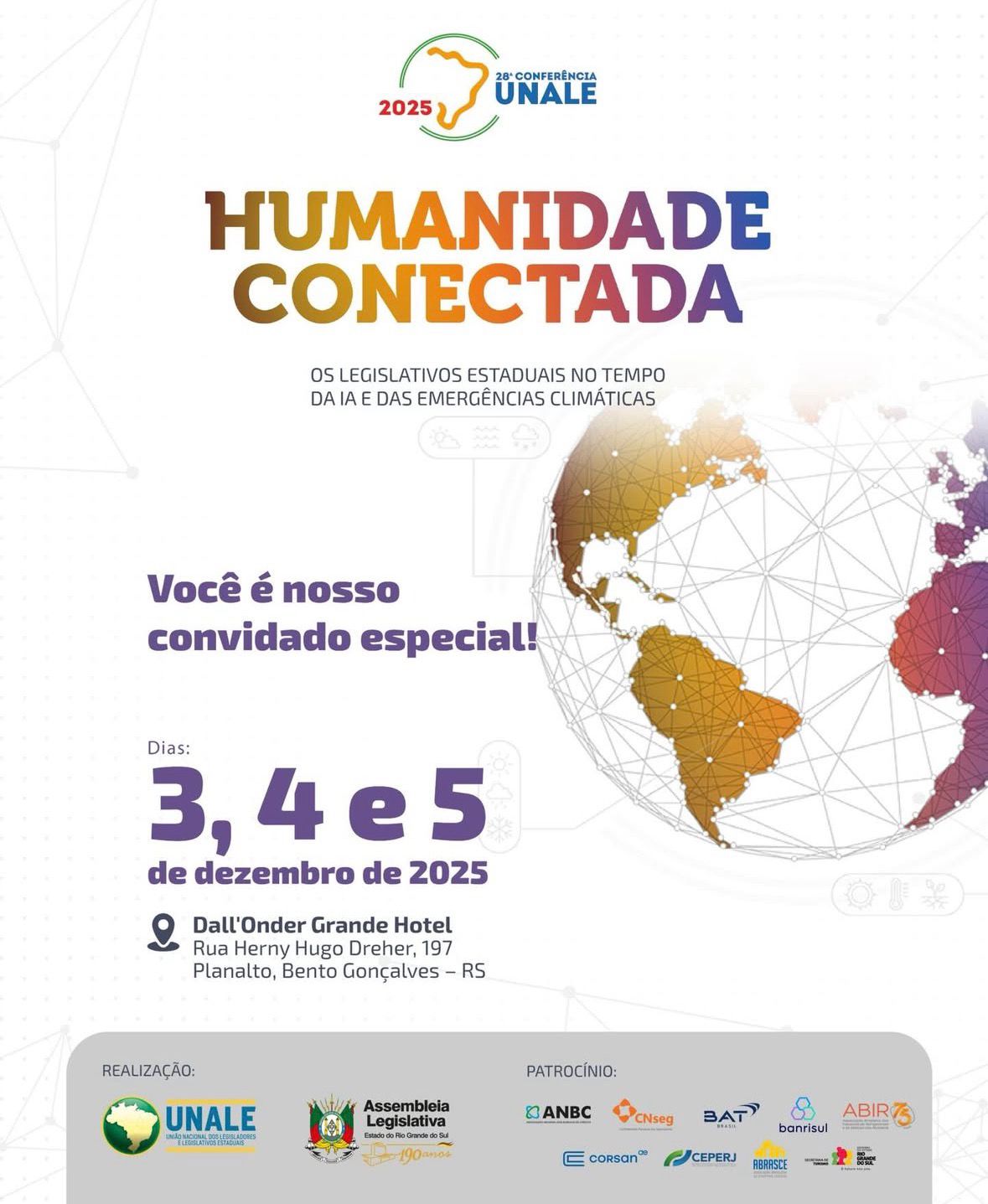 A 28• Conferência Nacional dos Legislativos, acontece de 3 a 5 de dezembro na cidade gaúcha de Bento Gonçalves, com o tema: Humanidade Conectada: Os Legislativos Estaduais no tempo da IA e das Emergências Climáticas”.
