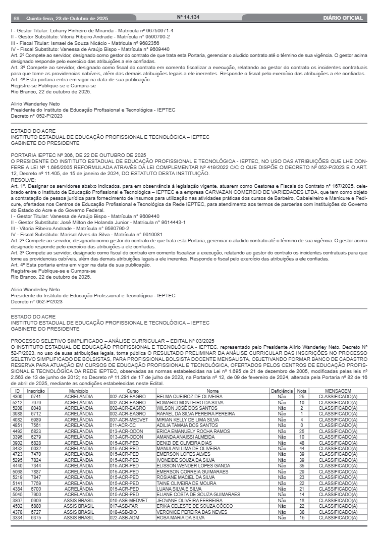 O Instituto Estadual de Educação Profissional e Tecnológica do Acre (Ieptec) divulgou nesta quinta-feira, 23, o resultado preliminar da análise curricular referente ao seletivo simplificado, Edital nº 03/2025, destinado à formação de cadastro reserva de bolsistas docentes mensalistas.