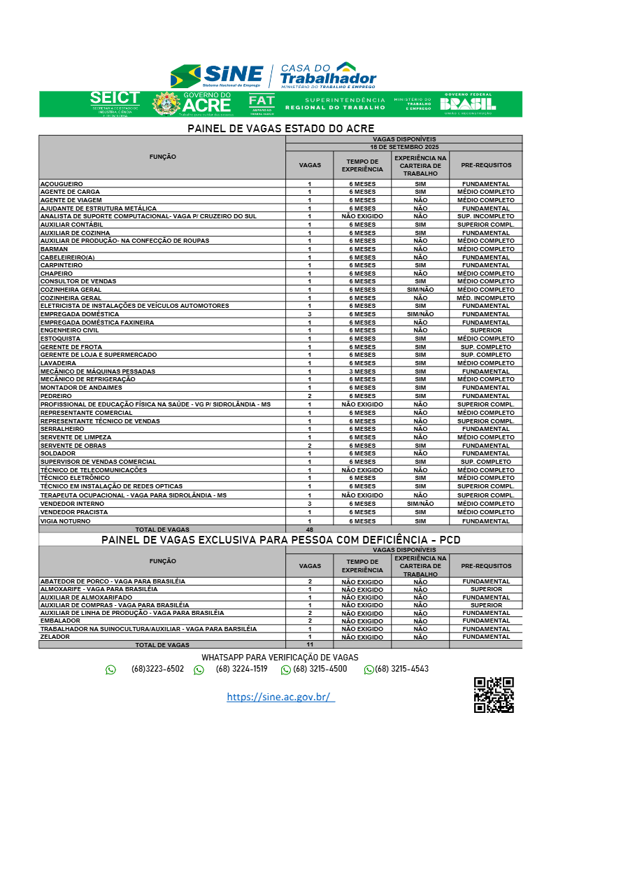 Os interessados devem procurar o Sine Acre para informações sobre critérios, prazos e atualizações, ou entrar em contato pelos telefones: (68) 3223-6502, (68) 3224-1519, (68) 3215-4500 e (68) 3215-4543.