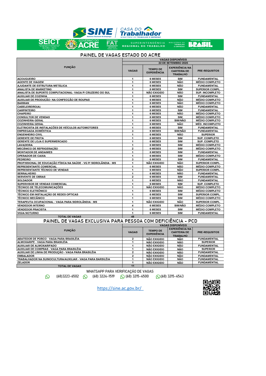 📌 Quem tiver interesse pode consultar todos os detalhes sobre requisitos, prazos e atualizações das vagas diretamente no Sine Acre, pelos telefones: